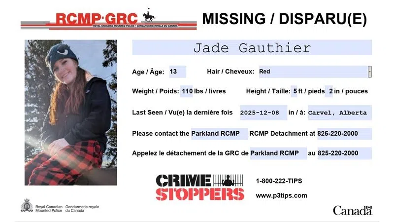 Parkland RCMP are seeking public assistance in locating missing 13-year-old Jade Gauthier. Mounties say Gauthier was las...